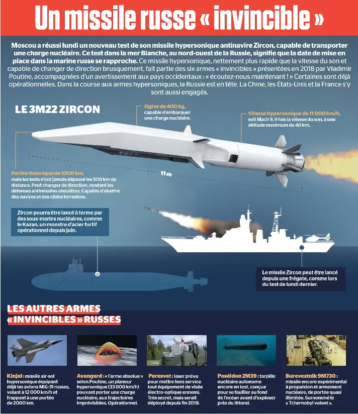 1 day agoPrésenté comme invincible par le président russe Vladimir Poutine le missile hypersonique qui appartient à une famille de nouvelles armes développées par.